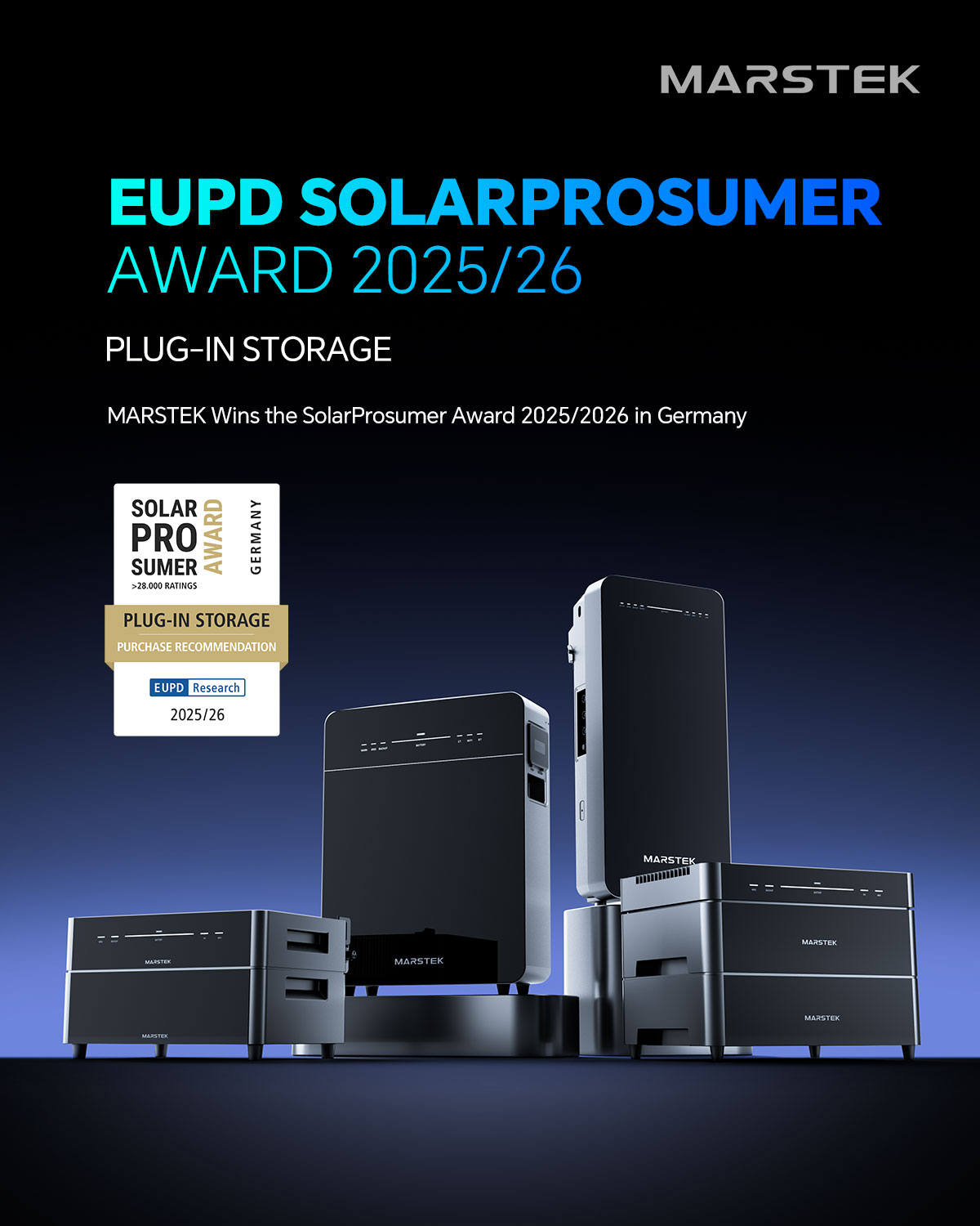 谨此荣幸宣布,MARSTEK于近日荣获由国际权威调研机构EUPD Research颁发的EUPD SolarProsumer Award 2025/2026 德国大奖,以表彰我们在并网储能系统领域的技术实力与市场表现。此项殊荣标志着MARSTEK正式跻身德国储能市场一级品牌行列,获得当地系统规划师及家庭用户的高度认可。